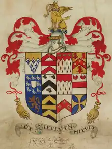 The original Paston Hall was built by William Paston (1378–1444) and was partly destroyed by fire during the reign of King Henry VIII (1509-1547) and was replaced by a 'great rose-coloured mansion' that appears in a portrait of Sir William Paston (1528–1610). According to Blomefield's History of Norfolk (1739/75) the new building had two court-yards, the inner one containing a well. Blomefield reported that the great hall was still standing but the chambers and chapel were in ruins. The canting arms of the Barre/Barrey/Berry family (Argent, a chevron between three bear's heads couped at the neck sable muzzled and collared or)[28] could still be seen carved over a doorway, symbolising the 1420[29] marriage of William Paston of Paston, Judge, son and heir of Clement Paston and Beatrix Somerton, to Agnes Barrey, a daughter and co-heiress of Sir Edmund Barrey.[30]