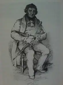 The first reference to a pastoral pipe comes from popular and fashionable pastoral dramas of the time with music such as the Gentle Shepherd in 1725[10] by the writer and poet Allan Ramsay, and the English Ballad The Beggar’s Opera in 1728, as a counter-measure against the influx of Pastoral Italian music. The opera featured an “en masse” dance led by a pastoral pipe and the scene was engraved by William Hogarth (1697–1764) who clearly shows a bellows blown bagpipe[11] similar to the one later depicted in the Geoghegan tutor. The Geoghegan repertoire draws on contemporary compositions namely the London organist John Ravenwood (1745), composer John Grey (1745),[1] the musical collection of William Thomson's Orpheus Caledonius in 1733, as well as operatic arrangements for the Ossian cycle.[12] The pastoral pipes were regarded in a classical or neo-baroque setting, played by gentlemen pipers and spread across the upper circles of polite society as the instrument of choice. An established bellows pipes with an extended range is noted to be played across Scotland no later than 1760 in the “Complete Theory of the Great Highland bagpipe” by Joseph MacDonald.[13]