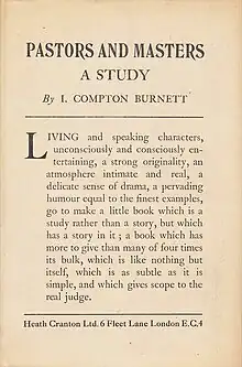 - Compton-Burnett, Ivy (1925). Pastors and Masters: A Study. Heath Cranton. Front cover of dustjacket.