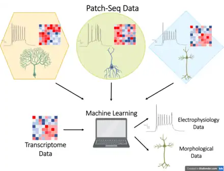 Designing workflow for processing and combining the resulting multimodal data depends on the particular research question patch-seq is being applied to. In cell typing studies the data should be compared with existing scRNA-seq studies with larger sample sizes (in the order of thousands of cells compared to tens or hundreds) and therefore greater statistical power for cell type identification using transcriptomic data alone. Correlation based methods are sufficient for this step.[21][47] Dimensionality reduction methods such as T-distributed stochastic neighbor embedding or uniform manifold approximation and projection can then be used for visualization of the collected data's position on a reference atlas of higher quality scRNA-seq data.[48] Machine learning can be applied in order to relate the gene expression data to the morphological and electrophysiological data. Methods for doing so include autoencoders,[49] bottleneck networks,[50] or other rank reduction methods.[48] Including morphological data has proven to be challenging as it is a computer vision task, a notoriously complicated problem in machine learning. It is difficult to represent imaging data from the morphological reconstructions as a feature vector for including in the analysis.[16]