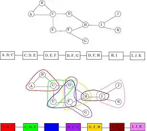 An example graph G with pathwidth 2 and its path-decomposition of width 2. The bottom portion of the image is the same graph and path-decomposition with color added for emphasis. (This example is an adaptation of the graph presented in Bodlaender (1994a), emphasis added)