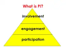 Public involvement (PI, formerly PPI, for Public and Patients' Involvement), in the context of health and care research, is the term for involving lay people (members of the general public, including patients and those close to them) as volunteers in influencing and shaping research.[1] It is a worldwide initiative to give the public an effective, active role in health and care research. The term "health and care" covers healthcare (medical care), public health, and social care. The purpose is to align research more closely with patients' and the public’s needs, skills and experience and thereby increase its success and cost-effectiveness.