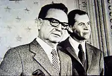 In 1965 he was elected to the National Congress as a Senator. In 1971, he became the president of the Senate. During the government of Popular Unity, headed by Salvador Allende, he was also the president of his party, and he led the democratic opposition to Allende within and without Congress.[7] He is credited, to some degree, with trying to find a peaceful solution to the country's political crisis. Distrusting Allende, Aylwin "demanded that the president appoint only military men to his cabinet as proof of his honest intent," which Allende did only partially, and Aylwin "apparently sided with pro-coup forces, believing that the military would restore democracy to the nation."[8] He stated very plainly that between "a Marxist dictatorship and a dictatorship of our military, I would choose the second."[9]