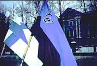 The chairman of the organization was Matti Järviharju, formerly vice-chairman of the Constitutional Right Party.[13] It had more than twenty local chapters.[6] Its organ, Ajan Suunta was edited in professional standard and managed to be printed more than once per year and had a correspondent Belgium, Matti Repo.[14] Its content is described by Dan Koivulaakso, Mikael Brunila and Li Andersson as "conservative and rigid".[6] The newspaper gradually started to come out with less and less pages and the number of contributors plummeted in 1999 until it stopped appearing in 2000.[3] The slogan of IKL was "Home, Religion and Fatherland". It adopted a black uniform, logo and flag that closely resembled that of its predecessor.[2] The organization's youth wing was called the Blue-and-Blacks, adopting the name of the youth wing of the original IKL.[14] When it was founded in 1995, there were grandiose, world-wide plans for activities, but it only ever held one meeting that same year with no further activities.[15] When IKL sent a delegation a May Day march organized by France's Front National in 1996, a representative of Sinimustat was present.[14] Efforts to form international ties continued when, in turn, Carl Lang, a Front National MEP, was present at the summer meeting of IKL and an attempt to form a network with Eastern European parties.[2]