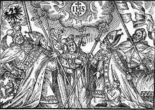 A 17th-century woodcut of five historical Polish patron saints venerating the Christogram; left to right: Wenceslaus, Adalbert, Casimir, Stanislaus, and Florian