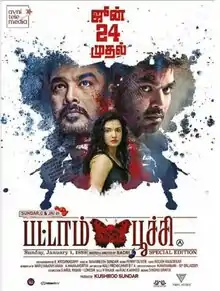 Pattampoochi (transl. Butterfly) is an 2022 Indian Tamil-language period psychological crime thriller film written and directed by Badri, produced by Khushbu Sundar, under the banner of Avni Cinemax. The film stars Sundar C. and Jai in the lead roles, alongside Honey Rose, Imman Annachi and Manasvi Kottachi. The film was released on 24 June 2022 to mixed reviews from critics, with criticism towards the screenplay and violence but Jai's performance received praise. Despite this, the film performed well at the box-office.[1]