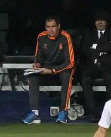 Clement was appointed assistant manager at Real Madrid after Ancelotti became their head coach in June 2013.[18] During his time at the club, Clement worked alongside Zinedine Zidane and coached players including Sergio Ramos, Xabi Alonso, and Cristiano Ronaldo.[17] He helped them win the Copa del Rey and tenth UEFA Champions League title, along with the UEFA Super Cup, at the end of his first season at the Bernabéu.[4][19] They also went on to win the club's first FIFA Club World Cup in 2014.[20]