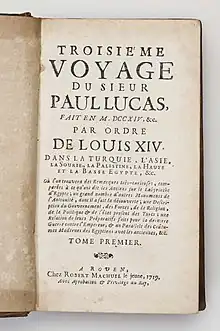 - Voyage du Sieur Paul Lucas, fait en 1714... dans la Turquie, l'Asie, la Syrie, la Palestine, la Haute et la Basse-Égypte, etc..., Rouen, R. Machuel le jeune, 1719; 3 vol.