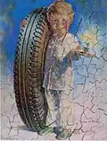 The now-updated version was used by Fisk Tires in advertisements, to showcase its newly introduced "Air-Flights." This included thirteen times in The Saturday Evening Post, between Feb 8 and Aug 23, 1930 (latter pictured).[108][109] It was offered to the public as a colorful art print that could be framed.[110] The cheerful mascot then appeared in different formats. These were either with or without a facial touch-up (three variants pictured).[111] For instance, on the front cover and endpapers of fairy or folk tale books for children in 1931. Titled (8): Candy Land, Jack and the Bean Stalk, Little Black Sambo, Peter Rabbit, Pied Piper, Three Bears, Three Little Kittens and Three Little Pigs.[112] They were generically subtitled Time to Re-tire / A Bedtime Story. It also appeared on ashtrays,[113] bridge score pads,[114] cigarette cases,[115] electrical clocks,[116] jigsaw puzzles (pictured),[117][118] matchbooks,[119] posters[120] and rubber heel replacements for shoes.[121] These were complimentary items for actual or potential customers (excluding the clocks).[122][123]