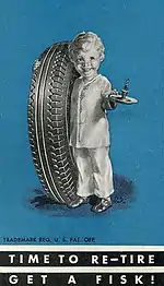 The Fisk Rubber Company was producing automobile, bicycle and carriage tires by 1901.[88] Its factory was located along the riverfront in Chicopee Falls, Mass. The plant pumped out some 230,000 tires in August 1921.[89] Fisk struggled financially before and during the Great Depression.[90] It was bought out by U.S. Rubber, manufacturer of the U.S. Royal brand (1940).[91] Its worldwide subsidiaries (under various names) received the unifying name of Uniroyal (1966).[92] This company merged with another giant and became Uniroyal Goodrich (1986). Its tire division was sold to Michelin (1990).[93] Fisk tires were sold primarily by Kmart (1965–78)[94] and Discount Tire (1996–2014).[95]