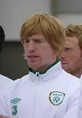 McShane received his first senior international call-up to the Republic of Ireland squad from manager Steve Staunton on 25 September 2006, for the UEFA Euro 2008 qualifiers against Cyprus and the Czech Republic.[43] An injury to Andy O'Brien and the suspension of Richard Dunne (the two central defenders that had started the match against Cyprus) meant that McShane was given his first international cap against the Czech Republic on 11 October 2006.[44] The match ended in a 1–1 draw, with McShane being named man of the match.[45] McShane was part of the team that missed out on place at the 2010 FIFA World Cup after being defeated by France in Paris in a play-off, and was the Irish player directly behind Thierry Henry[46] when Henry twice handballed late in extra-time before crossing for William Gallas to score an illegitimate, but accepted, goal.[47]