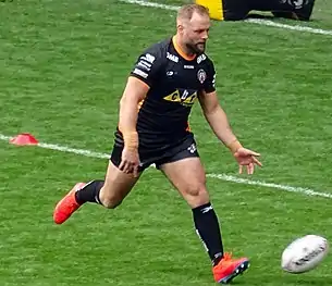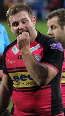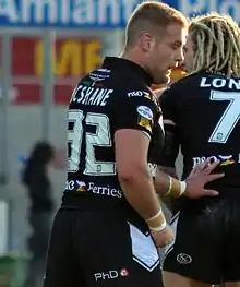 McShane was ever-present for Castleford in the 2016 season, appearing in every game.[9] He was an integral part of the 2017 squad that won the League Leaders' Shield and he played in the 2017 Super League Grand Final defeat by Leeds at Old Trafford.[17][18][19] He was named Castleford Tigers' 3rd Place 2017 Player of the Year.[20]
