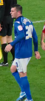 Robinson signed a one-year contract, with an option for a further year, ahead of the 2013–14 season,[40] and was appointed both club and team captain for the 2013–14 season.[41] He scored his first goal for the club – and his first goal for nearly five years – to open the scoring in a 3–0 defeat of Bristol Rovers in the FA Cup on 14 January 2014.[42] In April 2014, with Birmingham battling relegation, he incurred a three-game suspension for receiving 15 bookings in the season,[43] returning for the final day of the season as the Blues avoided relegation with a 2–2 draw at his former club Bolton. He won the club's Player of the Year award for that season.[44]