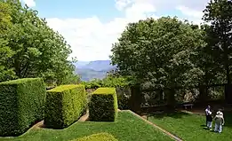 He made use of the surrounding outlooks and natural vegetation and he did use large native trees—such as the Illawarra flame trees and coastal cypress pine at "Gleniffer Brae"—when and where it suited his design. In the garden of "Mahratta", he mixed native trees with exotics.[11] At "Everglades", he created a small waterfall and "grotto pool" of natural appearance—clearly influenced by the natural watercourses of the Blue Mountains—and the garden has a lookout overlooking Gordon Falls and the Jamison Valley[39][3][40] Similarly, at "Leuralla", the garden overlooks the Jamison Valley. At "Gleniffer Brae", the garden framed views of nearby Mount Kiera and at Mt Kiera Scout Camp, he made advantage of distant views to the ocean.[41] However, Sorensen planned his gardens so that plantings screened views and other features, which were gradually revealed only by moving through the garden space.[3]