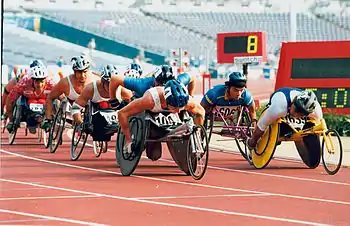 He competed but did not win any medals at the 1992 Barcelona and 1996 Atlanta Paralympics.[4] At the 1994 Commonwealth Games, he won a gold medal in the Men's Wheelchair Marathon and a bronze medal in the Men's Wheelchair 800 m event;.[5] At the 1994 Los Angeles Marathon, Wiggins and fellow French wheelchair racer Philippe Couprie made a pact that they would finish together, thus causing the first dead heat in the history of the competition.[3] He also won that competition in 1995.[6] He was the first person to break the 20-minute mark in the 10 km wheelchair race.[2]