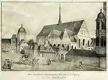 In 1229, friars of the Dominican Order settled in Leipzig and started building the Paulinerkirche in 1231 as their abbey church, within the city walls close to the gate "Grimmaisches Tor". It was built in the typical fashion of a church of a Mendicant order of the 13th century, with a choir and a nave with two aisles in the "Langhaus".[2] The church was consecrated in 1240 by archbishop Wilbrand from Magdeburg to St. Paul.[3] The church was part of a larger complex of medieval buildings which together formed the Dominican monastery of Leipzig.
