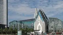 The new buildings at the university's main campus are inspired by the form and shape of the old church. The newly built heart of the university includes a room for common prayer and regular religious services, located exactly at the place of the former church.[3] The whole complex has a double function as a church (using the historical name Universitätskirche St. Pauli - University Church St. Paul) and as an assembly hall (Aula). The short name for the whole building with both functions is Paulinum. The first service in the new church was held on 6 December 2009 (the second Sunday in Advent), and it included a performance of Bach's cantata Nun komm, der Heiden Heiland, BWV 61.[16]