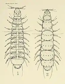 Pauropods are soft, cylindrical animals with bodies 0.5 to 2 millimetres (0.02 to 0.08 in) long.[4] They have neither eyes nor hearts, although they do have sensory organs which can detect light. The body segments have ventral tracheal/spiracular pouches forming apodemes similar to those in millipedes and Symphyla, although the trachea usually connected to these structures are absent in most species. There are five pairs of long sensory hairs (trichobothria) located throughout the body segments.[6] Pauropods can usually be identified because of their distinctive anal plate, which is unique to pauropods. Different species of pauropods can be identified based on the size and shape of their anal plate. The antennae are branching, biramous, and segmented, which is distinctive for the group.[7] Pauropods are usually either white or brown.[8]