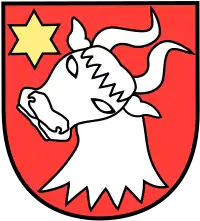 The modern coat of arms was adopted in the late 19th century, based on an 18th-century interpretation of an ambiguous seal from 1330 used by the lawspeaker of Oslo, Nikolas Paus. It was later given its current design by Hallvard Trætteberg, Norway's preeminent heraldic artist in the 20th century. It is blazoned in Trætteberg's book Norske By- og Adelsvåben as "in red, silver bull's head with neck, at the top dexter [six-pointed] golden star."[12] This coat of arms is also used in the comital letters patent of Christopher Paus.[22]