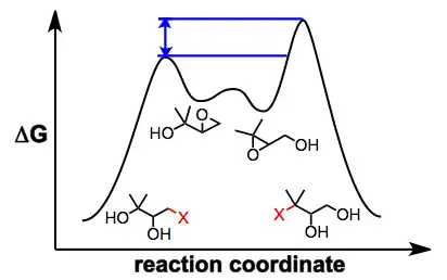 Several observations suggest that this mechanistic picture is oversimplified. Epoxide migration either does not occur or is very sluggish under aprotic conditions[3]—it has been suggested that nucleophilic attack is slowed by the coordination of metal ions to the nucleophilic oxygen under aprotic conditions. In addition, when an external nucleophile is added to equilibrating epoxide isomers, the ratio of opened products does not reflect the ratio of epoxide isomers in solution or their relative thermodynamic stability.[5] In situ nucleophilic opening of equilibrating epoxides is an example of Curtin-Hammett conditions—because the epoxides are equilibrating rapidly relative to the rate of epoxide opening, it is the kinetic barriers of ring opening that control the observed product ratio. In the example below, the product of opening of the terminal epoxide is the major product, even though the terminal epoxide itself is less thermodynamically stable than the internal isomer.