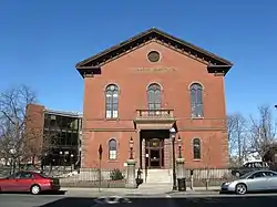 The Peabody Institute Library is the public library serving Peabody, Massachusetts. It was established in 1852 by a bequest from philanthropist and Peabody native George Peabody, and now has its main facility at 82 Main Street, with the South Branch at 78 Lynn Street and West Branch at 603 Lowell Street. The main library is housed in a two-story brick building built in 1853 which is now listed on the National Register of Historic Places.[2][1] The library is claimed to be the oldest public library in the United States to operate continuously from the same location.[3]