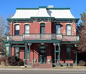 The Peabody Mansion is the former home of former Colorado governor James Hamilton Peabody. It was built on the corner of 4th and River, now 4th and Royal Gorge Boulevard (U.S. Highway 50) in Cañon City, Colorado.[1] The mansion is a red brick Victorian two-story and is the current home of the Cañon City Chamber of Commerce. The house was built in 1881 by James Clelland, Governor Peabody's father-in-law. In the early 1990s, the building was slated to be demolished, but city residents asked that it be spared. Subsequently, the city purchased the house, which had been split up into apartments, and renovated it into office space for the Chamber of Commerce. [2]