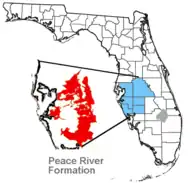 The Peace River Formation appears as an outcropping or is beneath a thin overburden from Hillsborough County to Charlotte County on the southern part of the Ocala Platform. extending into the Okeechobee Basin. It is widespread in Florida and part of the intermediate confining aquifer system.