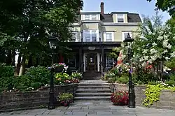 The Peacock Inn is a historic restaurant and inn in Princeton, New Jersey. The building itself dates to the 18th century and was originally located at the corner of Nassau Street and University Place. During the American Revolution it was the home of Jonathan Deare, and played host to members of the Continental Congress when they met in nearby Nassau Hall. It was moved to its current location in 1875 by famed archaeologist and Olympic athlete William Libbey.[4] Joseph and Helen O'Conner purchased the property in 1911 and opened the Peacock Inn, naming it after an inn in Derbyshire, England. The Inn has 16 guest rooms but is most known for its restaurant, consistently rated one of the finest in the state.[5]