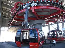 The Peak 2 Peak Gondola is a tricable gondola lift at Whistler Blackcomb Resort in Whistler, British Columbia, linking Whistler Mountain's Roundhouse Lodge with Blackcomb Mountain's Rendezvous Lodge. It is the first lift to join the two side-by-side mountains. It held the world record for the longest free span between ropeway towers at 3.03 kilometres (1.88 miles) until 2017 when the Eibsee Cable Car exceeded it by 189 metres.[1] It is still the highest point above the ground in a gondola at 436 metres (1,430 feet),[2] although a temporary aerial tramway in Switzerland used between 1979 and 1986 had larger span. The gondola was built by the Doppelmayr Garaventa Group in 2007 and 2008 at a cost of CDN$51 million.[3] The Gondola is the first Doppelmayr "3S" tri-cable lift in North America; there are four similar but smaller lifts in Europe which were built in 1991, 1994, 2002, 2004 and 2010 in Switzerland, Austria, France and Germany.[4] Whistler Blackcomb has touted the gondola as an iconic attraction and uses it to transport skiers in the winter months as well as sightseers year round.