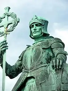 The memorial features a 2.1 m (6 ft 11 in) high bronze statue by George Frampton depicting Saint George in medieval armour, standing on a slain dragon. Saint George is raising the hilt of his sword in his left hand to form a cross, encircled by a wreath, and resting his left hand on a shield which bears Saint George's Cross. The cast bears the name and date "GEO. FRAMPTON RA / 1919".