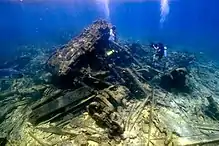 In 2004, divers from NOAA located wreckage believed to be from the Pearl during a debris removal dive. They were not able to complete a full survey at the time due to the challenging site environment.[2] The same dive team also located the wreck site of an unknown fishing vessel during the same trip, which they nicknamed the "Oshima" site as some of the components located were similar to the Japanese "Oshima" design.[28] Among the components located were "a six-cylinder Atlas Imperial diesel and machinery scatter, propeller shaft and propeller, a marine propulsion plant popular in the early decades of the 20th century." Researchers theorized that the wreckage was an East Asian fishing vessel that struck the reef sometime after 1918, based on the age of the components.[28]