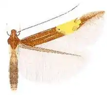 Male, female. Forewing length 3.4-3.8 mm. Head: frons shining ochreous-white, vertex and neck tufts shining brown, laterally and medially narrowly lined white, collar shining brown; labial palpus first segment very short, white, second segment three-quarters of the length of third, dark brown with white longitudinal lines laterally and ventrally, third segment white, lined brown laterally; scape dorsally shining brown with a white anterior line, ventrally shining white, antenna shining dark brown with a white line from base to two-thirds, followed towards apex by four partly white segments, two white, two dark brown, two white, ten dark brown and about seven white segments at apex. Thorax and tegulae shining brown, thorax with a white median line. Legs: femora shining pale ochreous, foreleg brownish grey with a white line on tibia and tarsal segment one, posterior half of two, anterior half of three and posterior half of four and five, tibia of midleg brown with white oblique basal and medial lines and a white apical ring, tarsal segments ochreous on the outside, greyish brown on the inside, segment one and two with inner apical spots, segment five entirely ochreous white, tibia of hindleg brown with a white very oblique line from base to beyond middle and a white apical ring, tarsal segments brownish grey, segment one with a white basal ring and an ochreous-white apical ring, segments two to five with ochreous white apical rings, spurs white dorsally, brown ventrally. Forewing shining brown, six narrow white lines in the basal area, a first subcostal, close to costa, from base to one-quarter, followed by a second subcostal between the end of the first subcostal and the transverse fascia, a medial just above fold from one-eighth to two-fifths, a short first subdorsal above dorsum near base, a slightly oblique second subdorsal from the middle of the medial almost to the transverse fascia, a dorsal from one-eighth to start of the subdorsal, a bright yellow transverse fascia beyond the middle, narrowed towards dorsum at both edges with a broad irregular prolongation towards apex, bordered at the inner edge by two tubercular pale golden metallic subcostal and dorsal spots, the subcostal spot with a blackish patch on the outside and more towards base, the dorsal spot slightly larger, bordered at the outer edge by two tubercular pale golden metallic costal and dorsal spots, the costal spot brown lined inwardly, the dorsal spot twice as large as the costal and more towards base, a white costal streak from the outer costal spot, a shining white apical line, somewhat irregular in width, cilia brown around apex, lighter towards dorsum. Hindwing shining brownish grey, cilia pale brown. Underside: forewing shining brown with greenish reflection, apically lighter and with a thin ochreous apical line, widening towards apex, hindwing slightly more greyish brown. Abdomen dorsally shining dark greyish brown, basally and apically more ochreous, segment six with a narrow ochreous-white posterior band, laterally ochreous-white, ventrally ochreous-yellow, segments banded shining white posteriorly and a very broad shining white ventral streak from segment one to five, anal tuft yellowish white.[1]