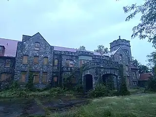 The first wing of the building was put up between 1905 and 1906, with its main elevation facing east onto Middle Highway. Two-and-a-half stories in height, the house was built of rough masonry granite with segmental relieving arches over the windows and doors. With Peck's expanding interests and activities, a larger residence was constructed between 1927 and 1928 north and west of the original section, forming a U-shaped court facing south; this major addition was more medieval in appearance but maintains the basic massing, height, and materials of the 1905 unit. At the northeast corner, a four-story, crenellated tower, formally containing a water tank, dominates the complex to this day.[3] As of 2022, the tower currently houses an AT&T transmitter that is powered by an external cable.