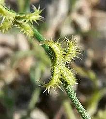 Pectocarya recurvata is a species of flowering plant in the borage family known by the common names curvenut combseed and arched-nut pectocarya. It is native to the southwestern United States and northwestern Mexico, where it grows in many types of desert habitat. It is an annual herb producing a slender, rough-haired stem, generally upright to erect in form to a maximum height of about 21 centimeters. The small, pointed linear leaves alternately arranged along the stem. The inflorescence is a series of flowers, each on a curved pedicel. The flower has small green sepals and a rounded white corolla. The fruits, borne in groups of four, are curved nutlets fringed with flat teeth, each measuring 2.5 to 4 millimeters long.