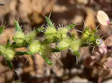 The inflorescence is a series of flowers, each on a curved pedicel. The flower has small green sepals, which are lined with hairs and long bristles. The fruits are rounded or oval nutlets with membranous wings along the sides.