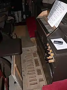 A pedalboard (also called a pedal keyboard, pedal clavier, or, with electronic instruments, a bass pedalboard[1]) is a keyboard played with the feet that is usually used to produce the low-pitched bass line of a piece of music. A pedalboard has long, narrow lever-style keys laid out in the same semitone scalar pattern as a manual keyboard, with longer keys for C, D, E, F, G, A and B, and shorter, raised keys for C♯, D♯, F♯, G♯ and A♯. Training in pedal technique is part of standard organ pedagogy in church music and art music.