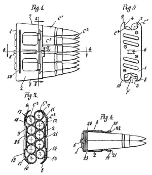 - An asymmetrical spring steel clip of ten rounds in a double-staggered column would then be inserted, feed end up, into the magazine against the spring pressure of the magazine follower; when fully inserted the clip would be caught and held by a catch. (Note: this clip, like the clip used in the Austrian Model 95 rifle, could only be inserted one way and thus could potentially cause confusion under the stress of combat). Unloading the magazine would be done by (if necessary) retracting and holding open the breech mechanism, then pushing the trigger forward from its neutral position; the clip and any remaining cartridges would be ejected upward.