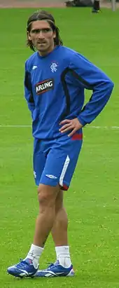 On 15 August 2008, Mendes completed a £3 million transfer to Rangers, signing a three-year contract.[23] He made his debut one day later, starting and winning the man of the match award in the 2–0 Scottish Premier League win over Hearts.[24] He scored his first goal for the club in the first Old Firm match of the season on 31 August 2008. Mendes scored the fourth goal of the match (and Rangers' third) when he received the ball from a Steven Davis corner and drilled it from 25 yards out into the Celtic goal. He was named SPL Player of the Month for August after a string of impressive performances.[25] He scored the second goal of the game in Rangers' title winning game against Dundee United in May 2009 but missed the 2009 Scottish Cup Final due to injury. He won the BBC Sportsound Player of the Year in 2008–09 for accumulating the most man-of-the-match performances throughout the season.[26] The following season, Mendes made eight appearances but was injured in November during a UEFA Champions League match against Unirea Urziceni, which was his final appearance.