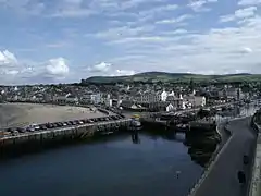 The town of Peel developed on the east bank of the river and the settlement was known as Holmtown until the 17th century. Later development, apart from the late 19th century guest house building on the sea front, has been inland, away from the coast. The name Peel was given to the castle by the English rulers, and the settlement then became Peeltown until about 1860. By the time the local councils were established in 1883, the name Peel referred to the town rather than the castle. In the 19th century, schooners built in Peel traded around northwest Europe and Peel fishing boats fished around the island and further afield to the southern coast of Ireland and near to Shetland. The harbour and breakwater were gradually improved, with much of the local income derived from the export of salted herring. By the 1880s, fishing was the main employer with about 3,000 men and boys employed, with ancillary businesses such as shipbuilding providing employment to hundreds more. However, with what is now seen as over-fishing, the number of boats leaving for Ireland dwindled from 300 in 1880 to a handful by 1915.[11]