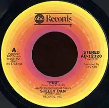"Peg" is a song by the American rock group Steely Dan, first released on the band's 1977 album Aja. The track was released as a single in 1977 and reached number 11 on the US Billboard chart in 1978 and number eight on the Cash Box chart.[4] With a chart run of 19 weeks, "Peg" is tied with "Rikki Don't Lose That Number" and "Hey Nineteen" for being Steely Dan's longest-running chart hit. In Canada, "Peg" spent three weeks at number seven during March 1978.[5]