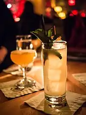 The bar's menu had a mixture of forgotten classics, including the Pegu Club cocktail, and Saunders' own creations, including the Gin-Gin Mule, Old Cuban, and Little Italy.[2] The bar was also known for its Fitty Fitty martini (half gin, half vermouth, with a dash of orange bitters to cut the vermouth's effect). At its opening, cocktails were $11-16.[4] The bar highlighted rye and gin, and was famed for not serving any vodka, allowing its guests to discover spirits they thought they might not enjoy.[6]