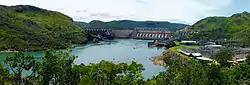 Studies for a dam at the Peixoto site were first carried out in 1947 by the Companhia Paulista de Força e Luz, which obtained rights to develop the site in 1950. The dam was built between 1952 and 1957 with help from the United States and the dam dedicated on April 30, 1957 by Brazilian President Juscelino Kubitschek.[2] The first two Francis turbine-generators came online in 1957, and eight more were installed by 1968, bringing the plant to its full capacity of 476 megawatts (638,000 hp). Since 1973, the dam and hydroelectric power plant have been operated by Eletrobras Furnas. Peixoto was the first of a cascade of nine dams to be built on the Grande River.[1]