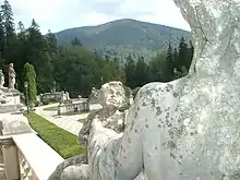 A towering statue of King Carol I by Raffaello Romanelli overlooks the main entrance. Many other statues are present on the seven Italian neo-Renaissance terrace gardens, mostly of Carrara marble executed by the Italian sculptor Romanelli. The gardens also host fountains, urns, stairways, guarding lions, marble paths and other decorative pieces.