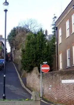 ![]() View up Watergate Lane with a dormer window forming part of the rear elevation of Pelham House just visible on the right of the trees | |