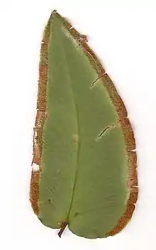 Pellaea paradoxa is a small hardy fern found north of Sydney in eastern Australia and Lord Howe Island.[1] Often growing in or near rainforests in rocky crevices. But it may occasionally be seen in drier areas. Fronds are usually curved, 4 to 9 cm long, and 1 to 4 cm wide. Leathery to touch and a dull green. Juvenile fronds may be heart shaped. The stalks are around 1 to 5 mm long. Sori appear in a band, usually 2 to 3 mm wide, at the edge of the underside of the fronds.[2]