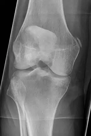 | Pellegrini-Stieda syndrome. Also visible is a fracture of the patella. |