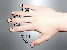 For convenience, pen spinners have adopted a common numbering to represent the fingers and the spaces between them, called finger slots. The fingers are numbered sequentially from "1" for the index finger, to "4" for the little finger, and the letter "T" is used for the thumb. Finger slots are represented by placing any two or more of these together. For example, the space between the index and middle fingers is called "12." A pen held between the thumb and ring finger is in slot "T3." Symbols and slots can be expanded to include other parts of the hand, body, and surrounding atmosphere. The webbing at the base of the thumb and index finger is called "TF," for thumb flap, and the palm is usually notated as "P." The "*" symbol is sometimes used to refer to the absence of a second body part or object holding the pen (e.g., a pen resting on the surface of the palm is in slot P*, or, more literally, PAir). Other slot systems have been invented in order to describe complicated positions, but these are usually only used when necessary to avoid ambiguity.