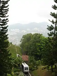 In the early days the only way to the top of hill was to travel on foot or horseback, or be carried on a dooly (sedan chair). The first attempt at a mountain railway on Penang Hill began in 1897 but it proved unsuccessful; it was built between 1901 and 1905 but had technical faults.[4][10] The Straits government then organised a new project to construct the Penang Hill Funicular Railway at a cost of 1.5 million Straits dollars. The railway was first opened to the public on 21 October 1923 and officially opened on 1 January 1924. The funicular railway led to a sharp increase in residential development as it became a location for the building of holiday villas and bungalows by Europeans and wealthy local Chinese towkays alike.[7] It also led to its development into a major tourist destination in Penang. It received well over a million visitors a year by 2012.[11]