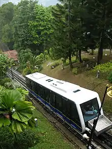 The Penang Hill Railway is a one-section funicular railway which climbs the Penang Hill from Air Itam, on the outskirts of the city of George Town in the Malaysian state of Penang. The railway first opened in 1923 as a two-section railway, but was overhauled in 2010 into a one-section system. It is a single-track railway with a passing loop, and it passes through a tunnel which is the steepest in the world.[2] The total journey time can take between five and twenty minutes.[3][4] The funicular train coach travels directly from the lower station to the top, but may stop at other intermediate stations upon request.[5]