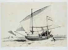 Pencalang has one or two masts, with a deck covered the entire hull and a room in the middle for the cargo hold, closed with a fixed deck.[2]: 27 The pencalang has a strongly curved front and rear stern and a round bottom with keel. The low freeboard is raised midship through the starboard. The ship has heavy transverse beams and a partial or continuous deck. A deckhouse has been built over most of the ship's hull. The helmsman is protected by a roof. The ship is steered with a side rudder that can be used by means of a hook on both sides of the ship. The sturdy mast, placed against a watertight bulkhead, can be lowered onto a mast support. The ship has a very wide and low tanja sail with boom. The rigging is connected to a long bowsprit. The crew is about 8–20 people. The length of the original local ships was 10.7 to 16.5 m with 3.7 to 5.5 m width. The draft is 1.8 to 3.7 m, slightly larger than those built for individual merchants. For the VOC they had a length of 55–60 ft (16.76–18.29 m) and a load capacity of 20–35 last (36.2–63.35 metric tons) at the beginning of the 18th century; later they became even larger with a length of 60–75 ft (18.29–22.86 m) and a capacity of 60–80 last (108.6–144.8 metric tons).[6] Smaller than that they are usually used by pirates.[2]: 27